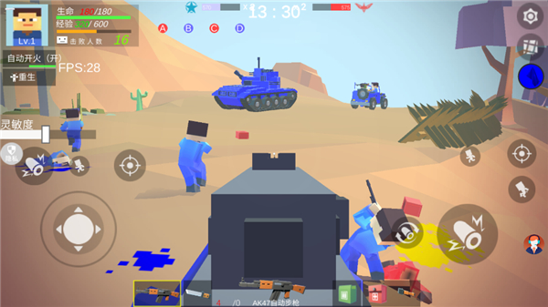 4、通过左下角控制角色移动,右下角进行瞄准和射击,战斗目标是在对战中比敌人更快积累到200分获胜。