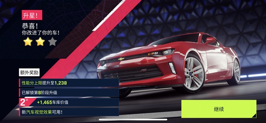 也就是说,之前的科迈罗四个属性只能强化到3级就满了,但升星之后,这四个属性就可以强化到8级,让每一项属性都更加强大,从而提升赛车整体表现。