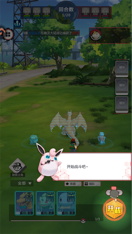 7、安排宝可梦上阵,并点击【开战】开始回合制战斗。