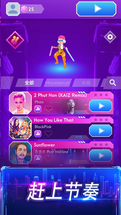 2、3D影像的设计给玩家强烈的刺激感,享受音乐的魅力。在海量歌曲中不断完成挑战。