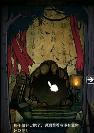 4、按照提示进入山洞,点击墙上的火把架,将火把放上去点亮洞内环境。