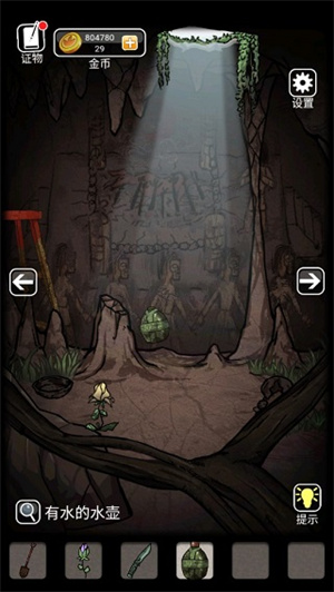 10、点击之前放置用于收集水的水壶(需等待一段时间才能收集),向右走到有壁画的房间,使用水壶浇灌地上枯萎的花,再用长棍戳天花板上的裂缝。
