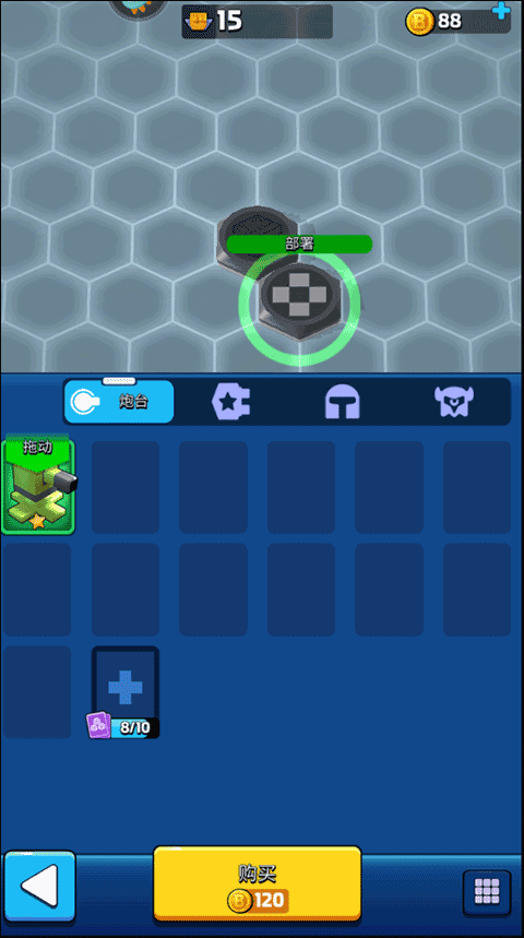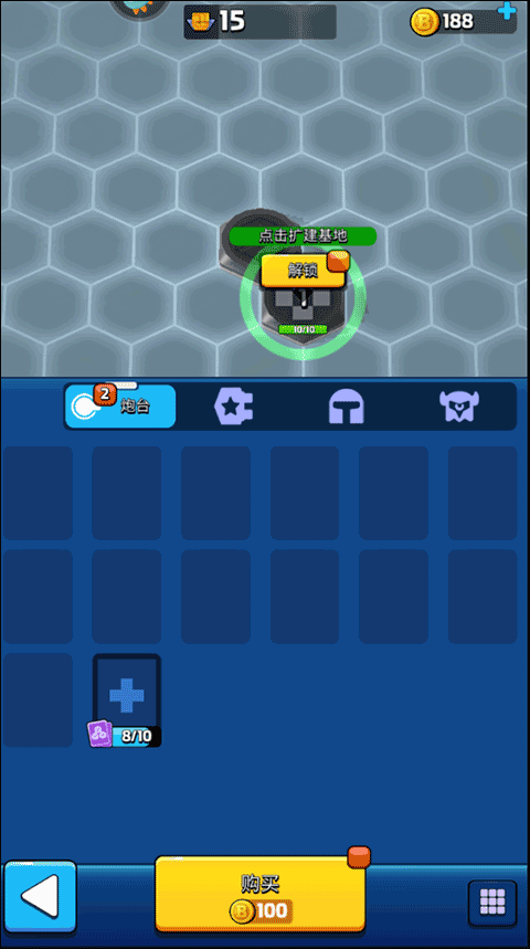 6、点击编辑界面上方的建筑选项,再选择下方的购买按钮,即可完成对炮塔的购买与装备。