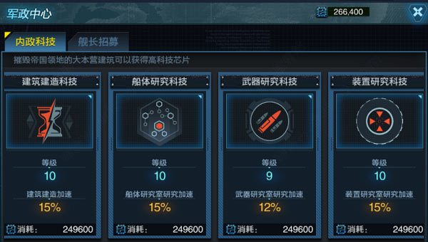 军政中心提供军政科技研究功能,科技研究能够显著提升基地整体发展效率。因此,只要有时间和资源,应优先提升科技等级,以保证长期成长的稳定性。