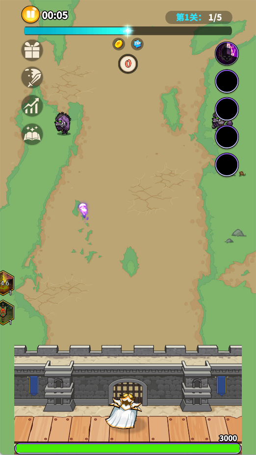 1、打开英雄防线游戏后进入战场,操控你的英雄在城墙上迎击源源不断的小怪,体验守护城堡的紧张感。
