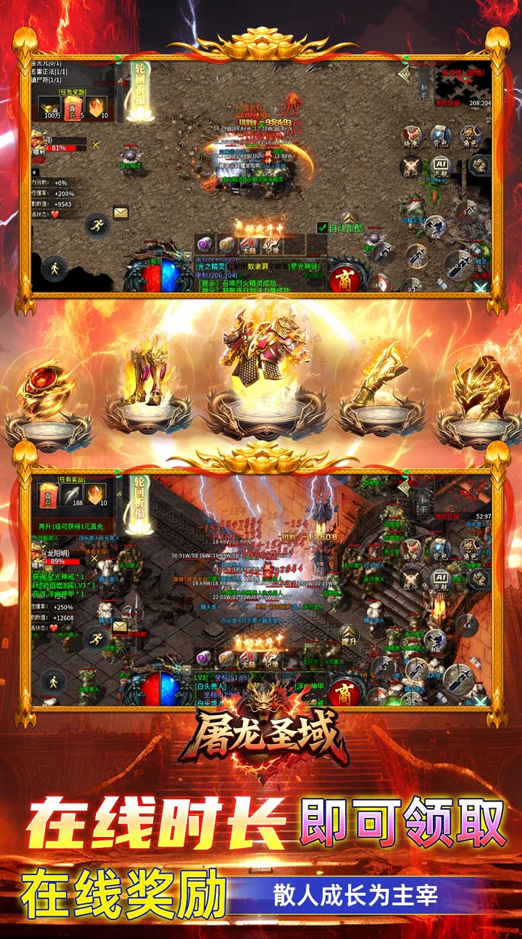 1、屠龙圣域种类繁多的装备等着你带回家,玩家可以通过击败怪物获得。