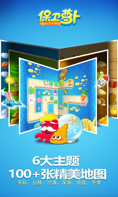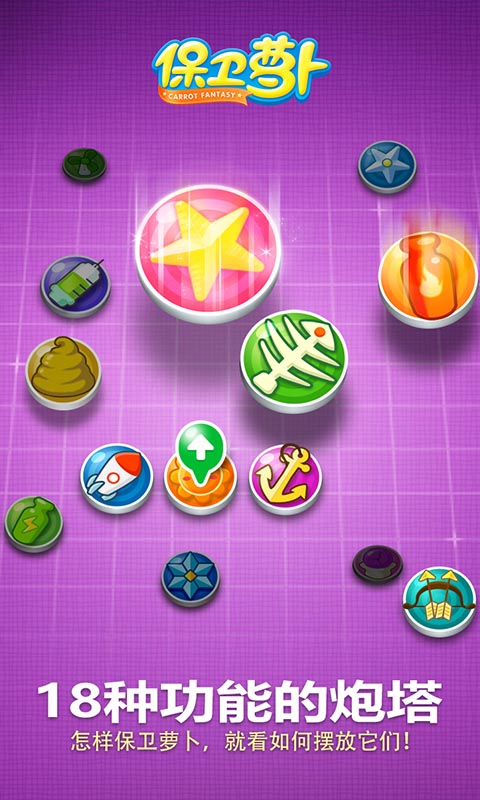 保卫萝卜是一款超萌的塔防手游,制作精美,风格真实可爱,在全球口碑极佳。游戏中有各种风格各异的防御塔,有趣的音效和搞笑的怪物形状和名字,大大增加了游戏的趣味性。而且每张地图中都散落着大量的道具,不同的主题配备了各具特色的道具,比如天空主题中散落在地图上的云彩、彩虹、热气球等。不要因为它们的卡通造型而不忍心清洗它们。要知道,清理完这些道具后,不仅可以扩大可用地形,还可以获得50个甚至更多的金币。