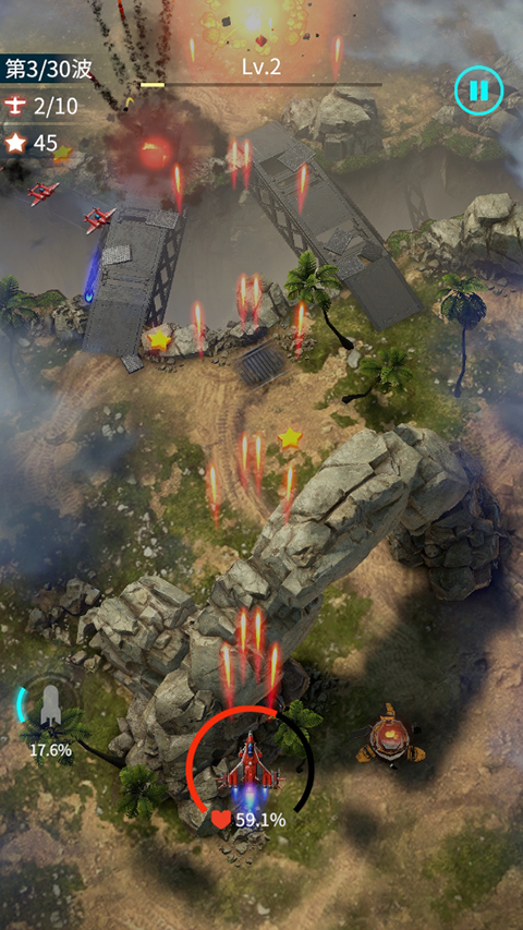 3、擎天战机以“沉浸式3D空战+Roguelike战略射击”为核心特色,创新融合经典垂直射击玩法和随机技能养成系统。