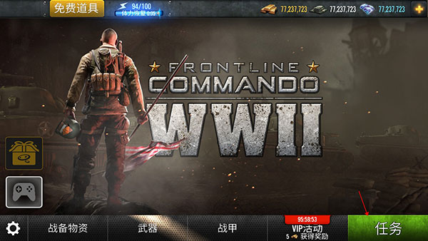 5、教程结束后会到主界面,这里有物资、武器、战甲什么的,想开始任务的话点右边的“任务”就好。