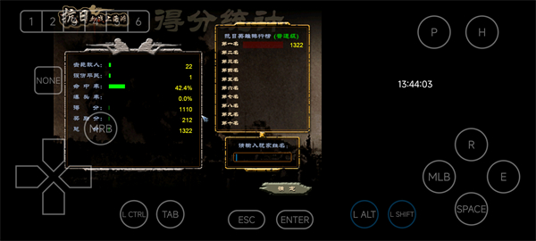 4、关卡完成后会进入得分统计界面,可以查看击敌数、命中率等数据,还能输入姓名,把成绩记录到排行榜上。