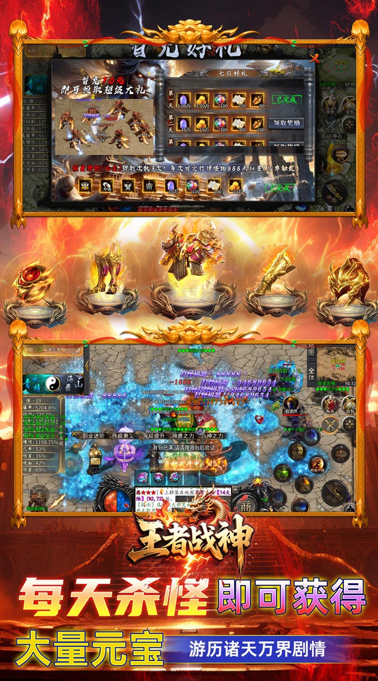 王者战神是非常激情的传奇手游,提供了非常丰富的职业,每个职业的战斗方式都不一样,技能效果也不同,可以在战斗的过程中带来视觉山的体验,同时,还为小伙伴提供了高爆率,在地图中砍boss的时候会爆出大量的武器和装备,还支持回收,此外,还提供了丰富的奖励,随时可以在线登录领取,让自己可以快速的成长,十分的好玩,感兴趣的小伙伴可以前来下载体验。