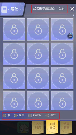 4、在“笔记”页面下方,你还能看到黄色的小便签,旁边还有“心跳回忆”和“结局收集”的选项。