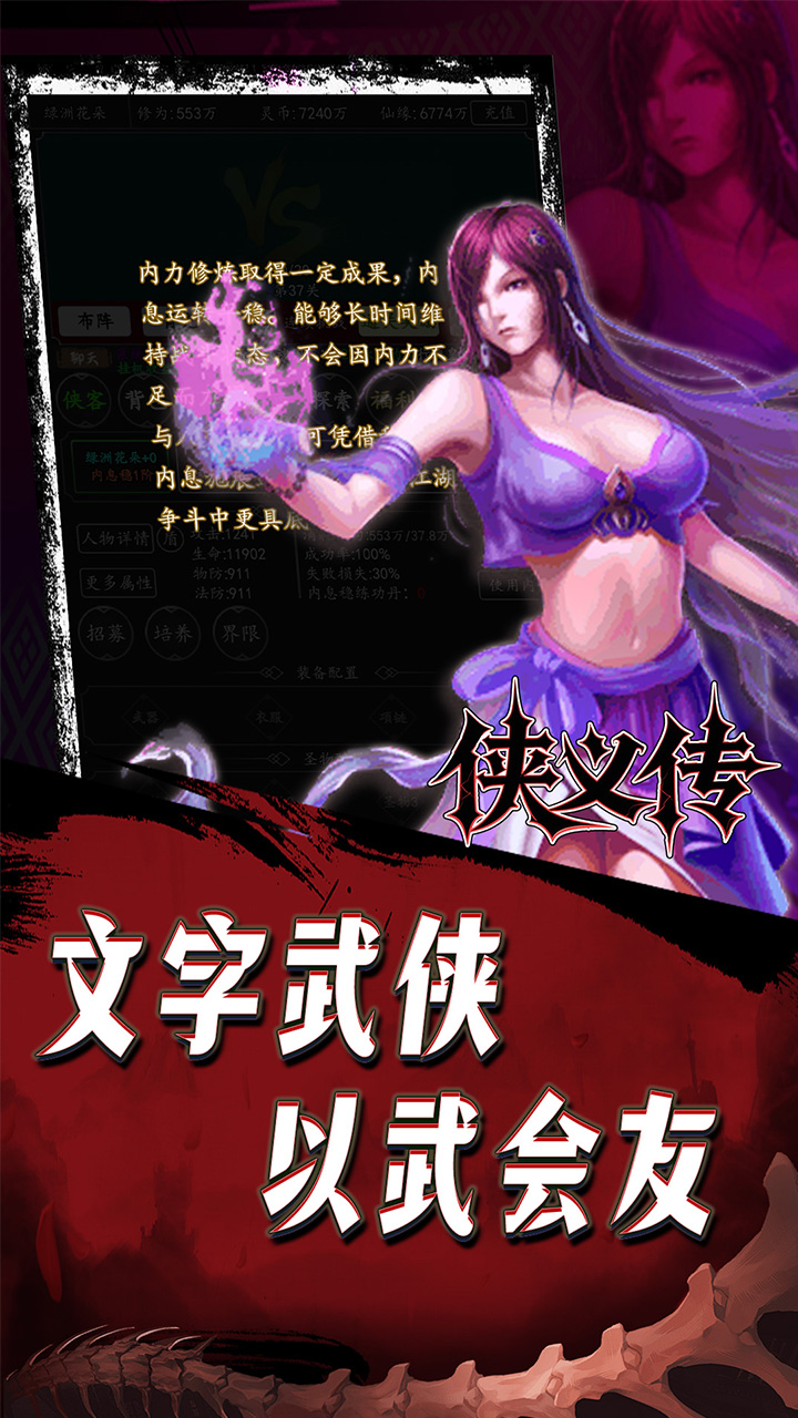 侠义传是一款基于文字的休闲武侠游戏。它具有武术的原汁原味,重现经典。数十个武术派别、隐士和名师,数百种独特的武术技巧和永恒的经典,无数的冒险和冒险,以及各种各样的生活体验,为你提供了极高的自由度,供你选择和享受。这里本来没有武侠世界,但因为有你,武侠世界才变得多姿多彩。无论是强者救弱,还是冤仇仇报,每个人都可以书写自己的传奇。