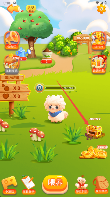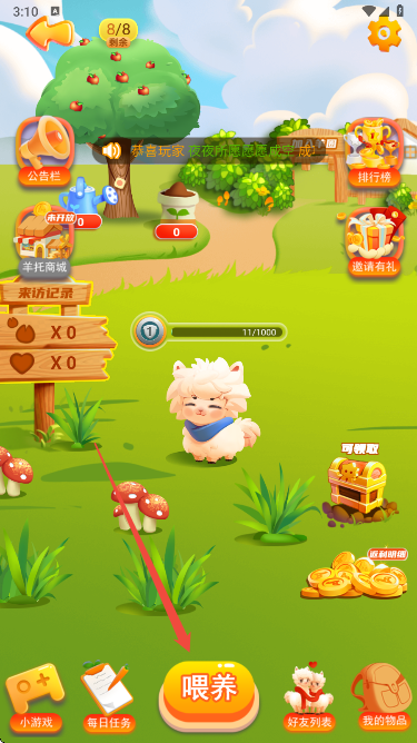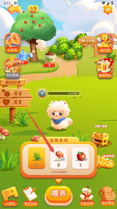 6、收集好喂养材料后,点击APP下方的 “喂养” 按钮,即可消耗材料为专属小羊喂食,助力升级。