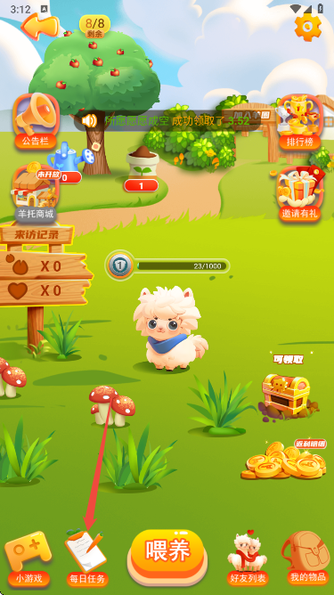 7、除宝箱外,完成APP内的每日任务,也是稳定获取小羊喂养材料的重要途径。