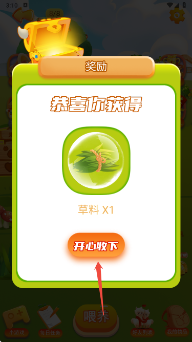 4、喂养材料可多渠道获取,首要方式是点击APP右下方的宝箱图标,开启材料领取通道。