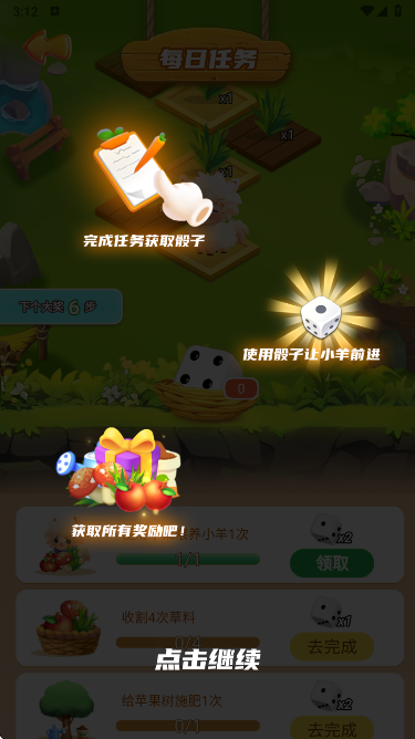 8、每日任务流程:完成指定任务领取骰子,使用骰子让小羊在地图前进,沿途可拾取路线上的奖励(含喂养材料)。