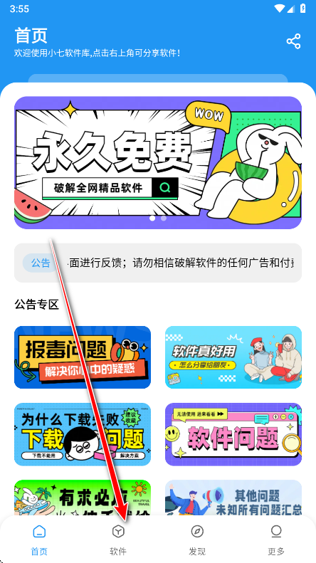 1、打开小七软件库,进入首页后,点击底部的 “软件” 选项,进入软件列表页面。