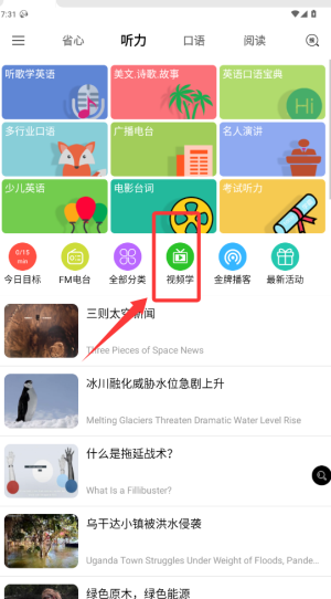 2、主界面找视频课程按单元学,用 “影子跟读舱” 录音对比,AI 纠音提升听说能力。
