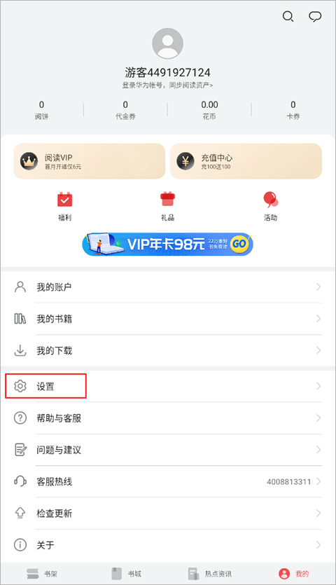 1、打开华为阅读APP,进入“我的”界面,点击“设置”。