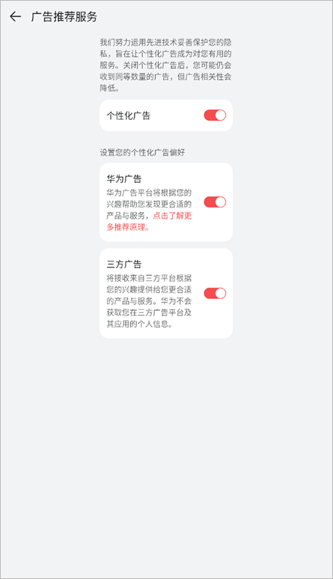 4、点击右侧开关关闭广告推荐服务,即可减少广告干扰,提升阅读体验。
