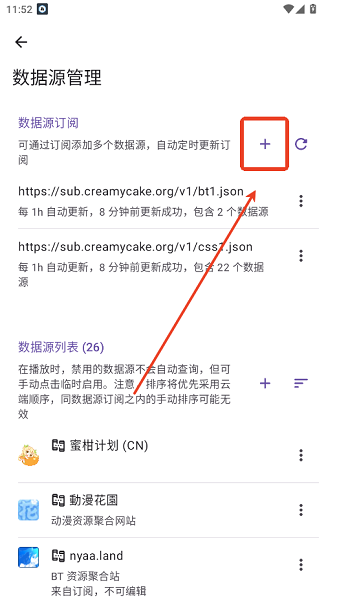 3、在源管理界面中,点击“+”按钮来添加你自己的数据源。