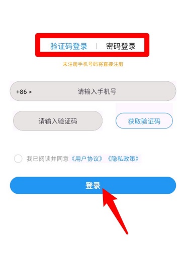1、用户可选择验证码登录或密码登录方式,输入手机号和对应验证码后点击登录按钮即可进入应用。