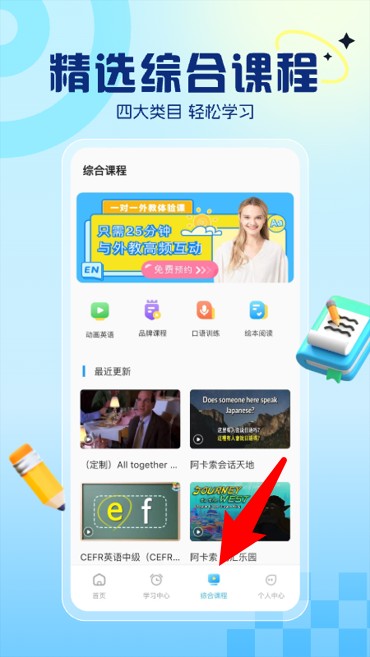 4、精选综合课程分类清晰明了,用户可以根据兴趣选择适合自己的外教课程,进行高效的在线学习。