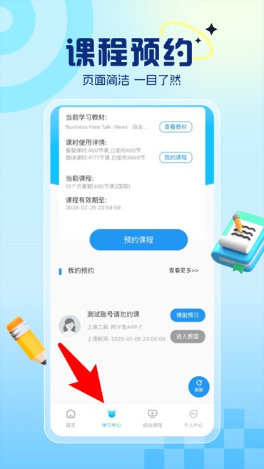 3、点击底部的学习中心即可查看课程预约信息,用户可以快速进入课堂或查看当前课程的具体安排。