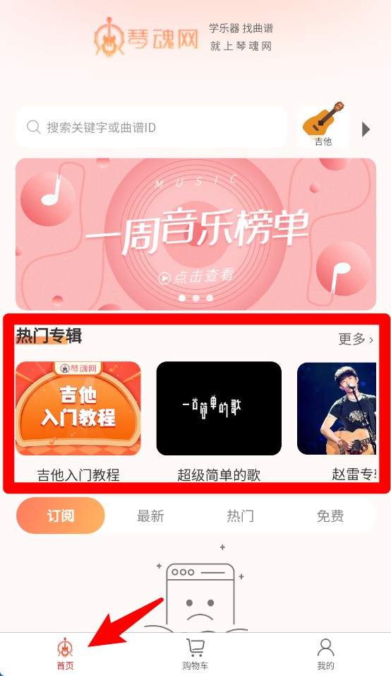 2、首页会展示音乐榜单和热门专题内容,例如吉他入门教程,方便新手快速找到合适的学习入口。