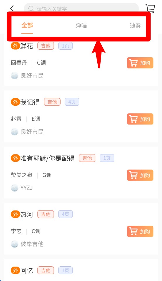 3、曲谱列表页提供分类筛选功能,用户可根据弹唱或独奏等演奏形式,快速定位所需的曲谱资源。