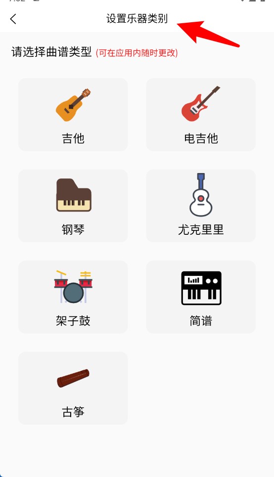 1、在设置乐器类别的页面中,可以选择吉他、电吉他等不同类型的曲谱,满足用户个性化的学习需求。