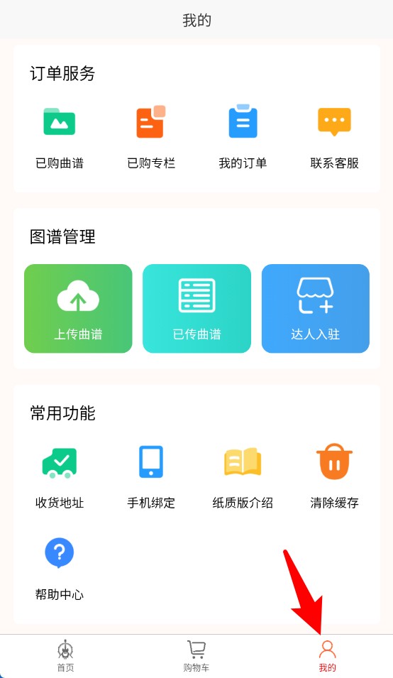 4、在“我的”页面中可以管理订单、上传曲谱以及申请达人入驻等功能,方便用户进行个性化操作和管理。