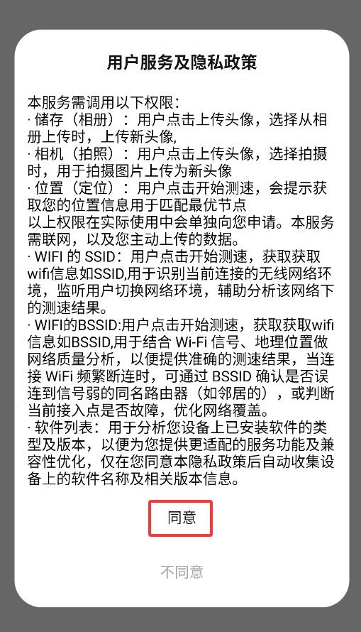 1、首次启动APP会弹出用户协议,点击同意后即可进入网络测速平台主界面。
