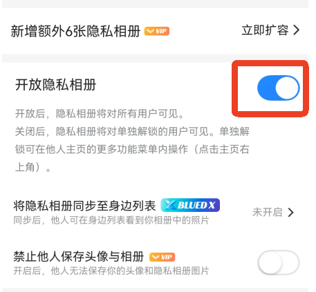 3、将【开放隐私相册】右侧的滑块按钮开启即可,开启后你的隐私相册将对所有用户可见。