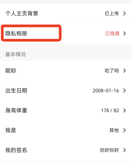 2、在页面中找到【隐私相册】选项,点击进入该功能设置界面。