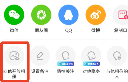 2、在弹出的功能菜单中,选择第一个选项【向他开放相册】,即可单独授权该用户访问你的隐私相册。