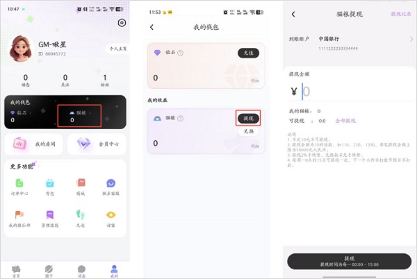 打开客户端 → 【我的】→【我的钱包】→【猫粮】→【提现】