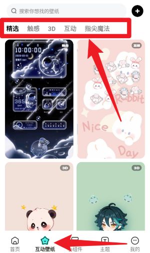 3、切换到底部的互动壁纸栏目后,可以在顶部选择触感、3D、互动、指尖魔法等类型,尽情浏览创意互动壁纸。