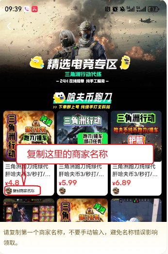 重新进入商品页后,复制第一个商品卡片下方显示的商家名称,建议直接复制粘贴。