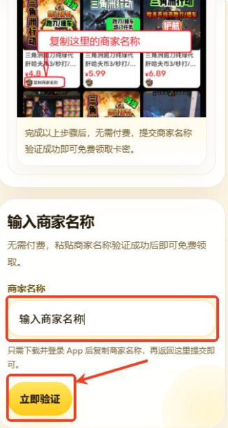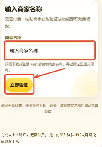 把复制好的商家名称粘贴到下方输入框,验证成功后,即可直接查看卡密。