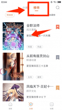 2、进入分类页面后,选择榜单栏目,你就能看到包括全职法师在内的热门漫画排行,找到当前最火的漫画。