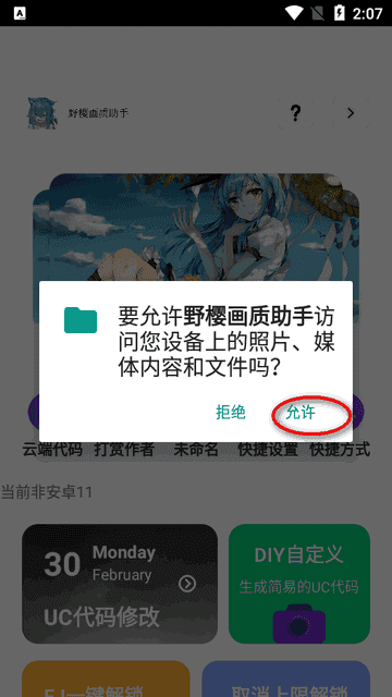 1、打开野樱画质助手,并点击“允许”同意相关的权限请求。